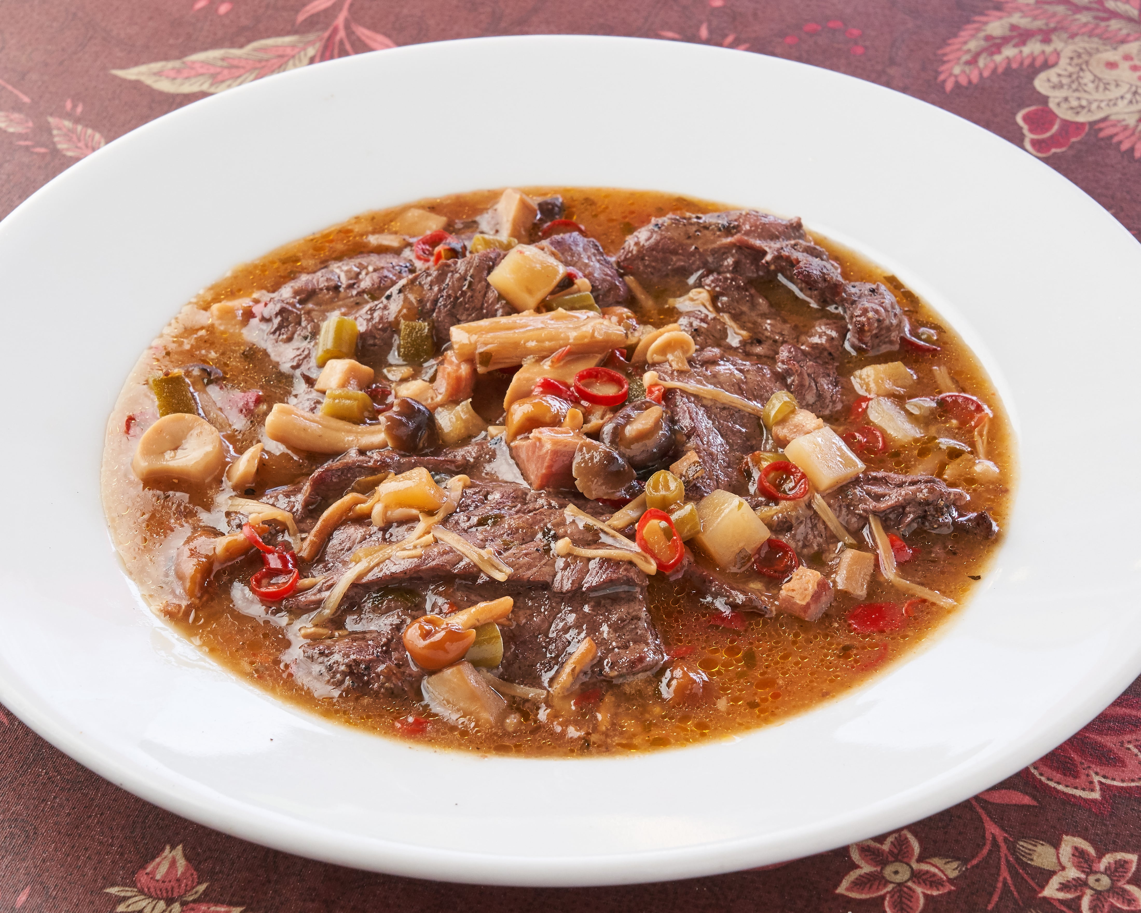 ボリューム満点牛ハラミ肉をピリ辛のソースで。